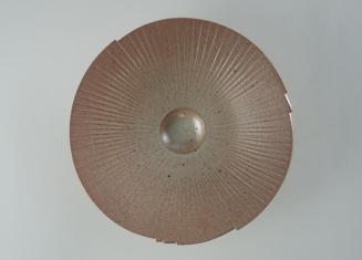 DescriptionShallow circular bowl with a carved stepped rim, and a small base and foot; interior is carved with lines radiating from a small circular well at centre; overall glaze of reddish brown and beige with speckles;Status