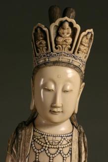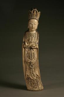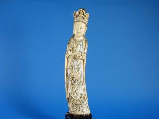 DescriptionThe Lady wears a crown or tiara with five buddha's in cartouches on it. Her flowing robe is bedecked with strands of beads or pearls & small rosettes. The curve of the ivory tusk gives her a swaying appearance. She holds a small jar in one hand & she stands on a wooden stand. There are bits of blue paint left in places around her crown, robe & arm bands.Status
