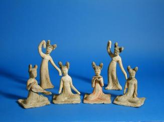 DescriptionSeated figure of a woman musician; she is holding towards her mouth a wind instrument resembling a harmonica but made of reeds (it is larger & crescentic); her hair is done up in two side rools; much red pigment remains on her dress; black pigment delineates her hair , eyes & eyebrowsStatus