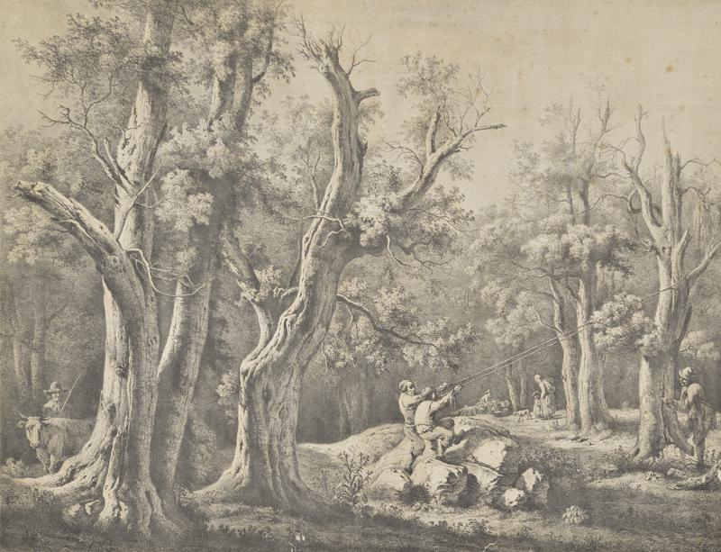 DescriptionThree men are trying to pull over an old tree. A man in the background with wood on a cart. A man on the left with a cow. A woman collects twigs.Status