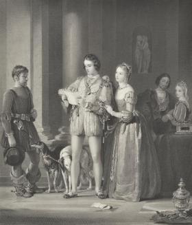 DescriptionA young man has just received a message & is reading it while a young lady rests her hands on his arm & shoulder. Two dogs stand between the young man & the messanger. Another couple look on from behind.Status