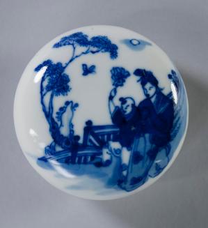 DescriptionCircular rounded sealpaste container with fitted lid is decorated in underglaze blue. The lid has depictions of a woman and a child in an outdoor setting with a tree, rock, and moth and the bowl has decorations of rocks and flowers.Colour: blue; white