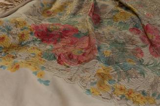 DescriptionLarge, rectangular shawl, gold tassels on all edges. Center has embroidered gold design, surrounded by red & blue flowers, & bunches of flowers in each corner.Status