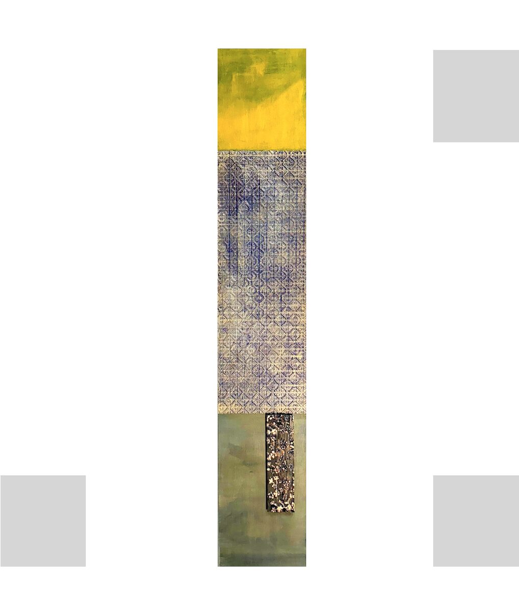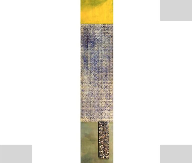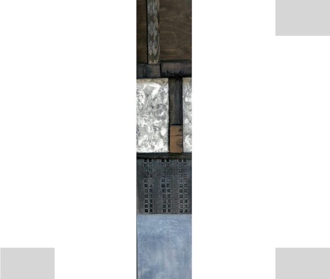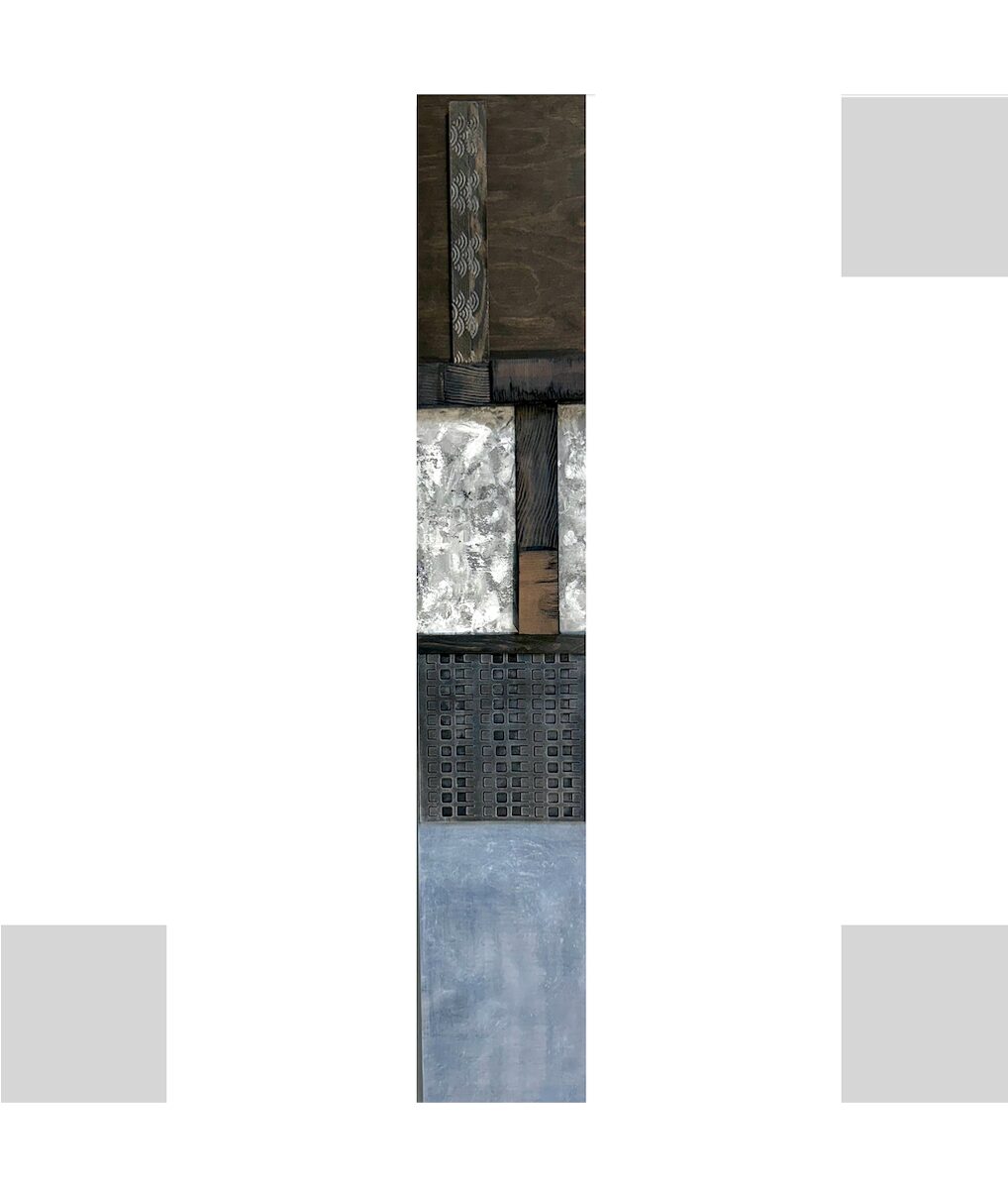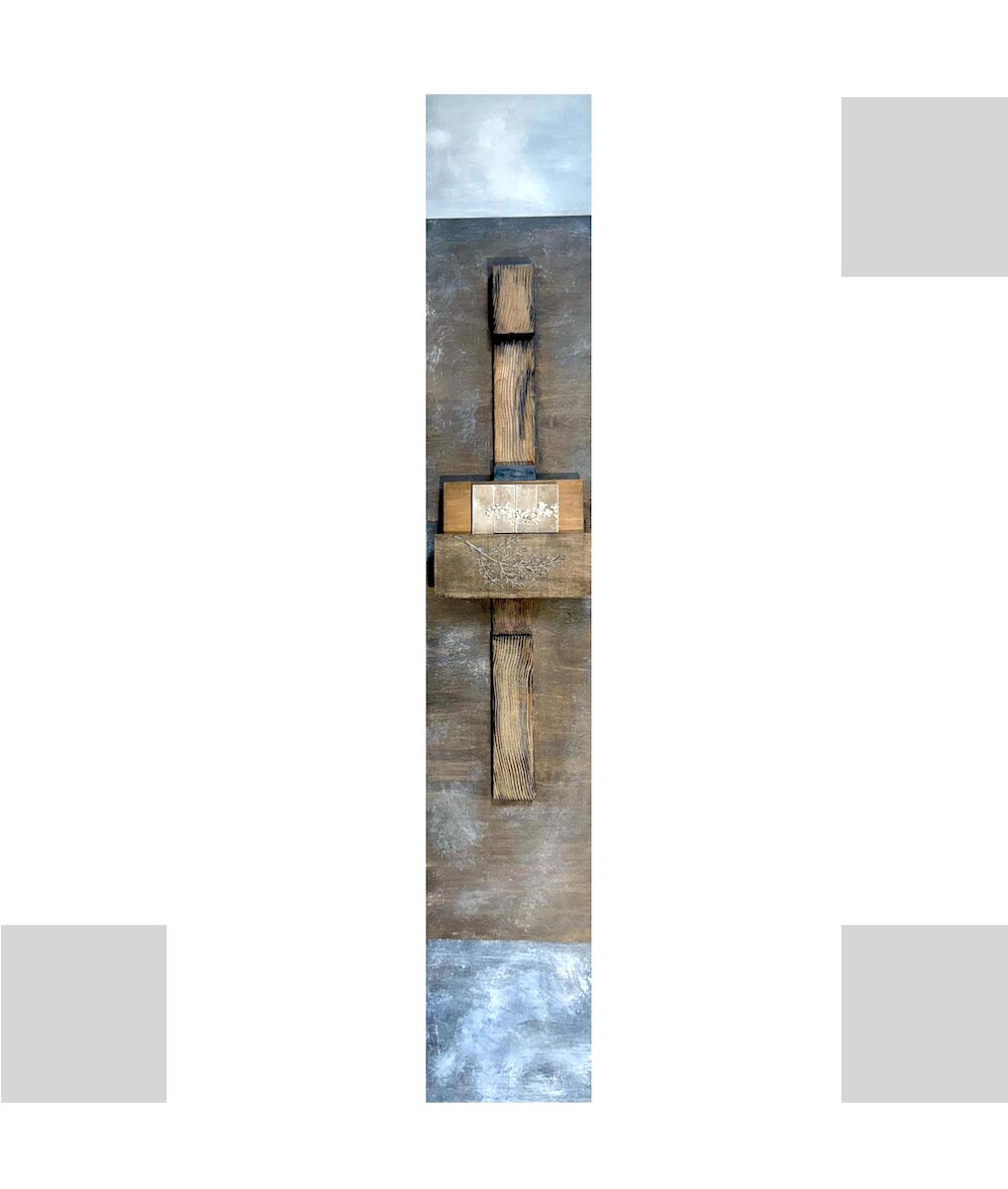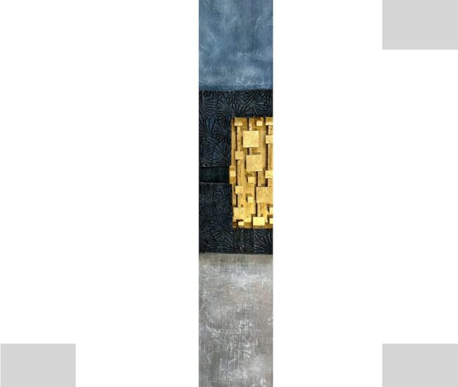 “Derek makes his sculptural paintings from natural, earthbound imagery using the simplest of materials. His paintings are on wood panels which he elaborates variously with modelling paste, wood detail, paper, gold and silver leaf to complement what can be achieved with acrylic paint. The texturing is all done by hand, often transforming the materials into quite different substances, and something of this alchemical process can be felt in his work. The images come from geological, biological, and cultural spheres, and can be accompanied by geometrical and mythological patterning to create both abstract and totemic works.
