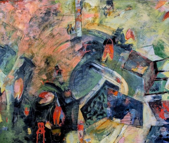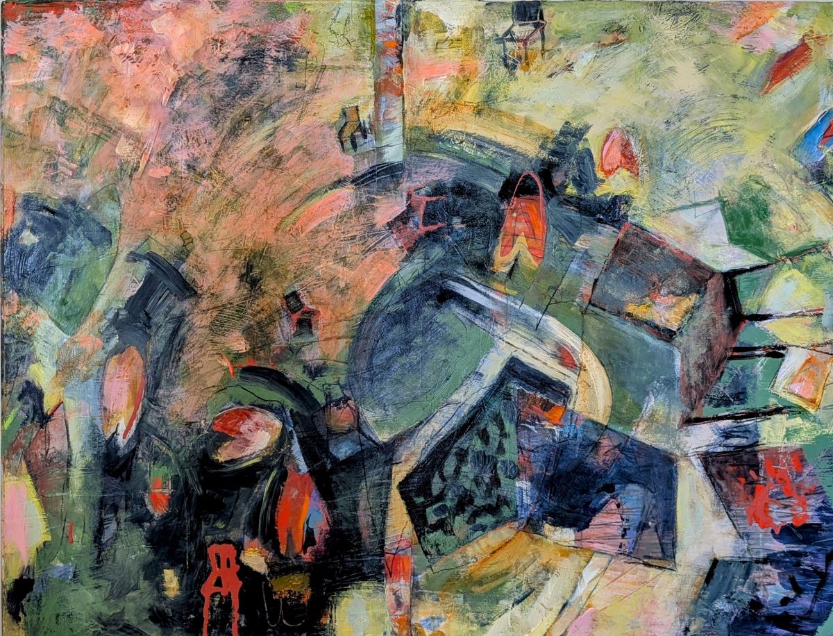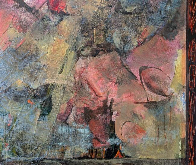 “I love to paint. I love the brilliance of the colours and the feel of paint being pushed around. Building layers of paper, tissue, plastic, charcoal, pastel, grease pencil and ink, I don’t worry about the outcome. What is left on the surface always reveals the history of what is below.