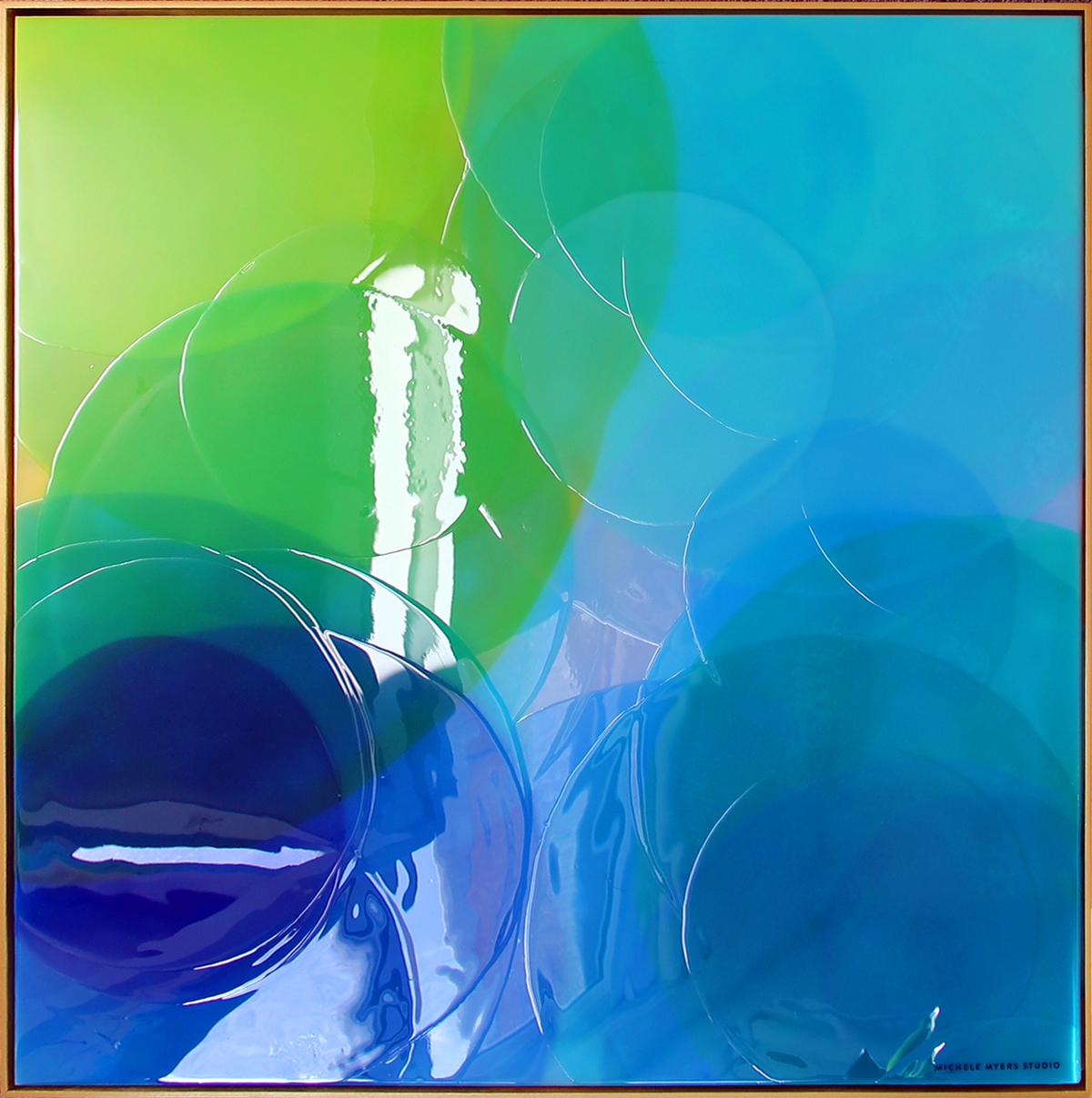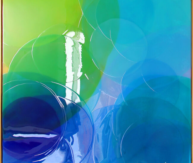 With resin, the process is slow and thoughtful. Each layer is a careful consideration in colour theory and transparency. As well, an exercise in patience as it takes hours for the resin to cure. Thus, each painting can take weeks to complete.