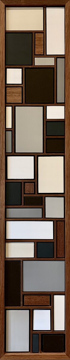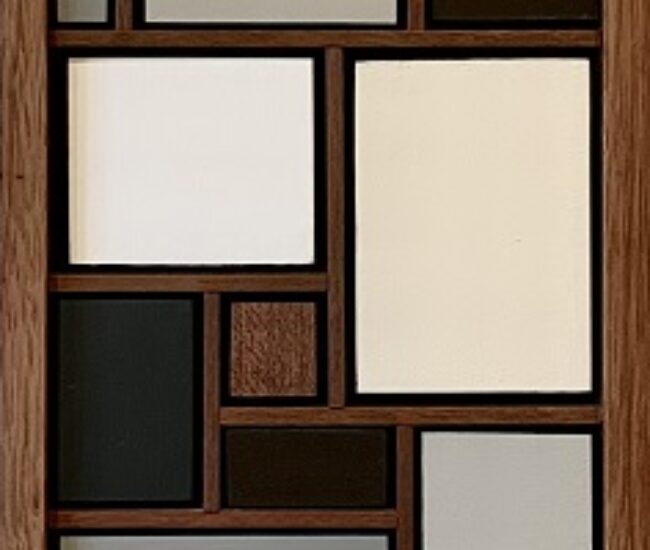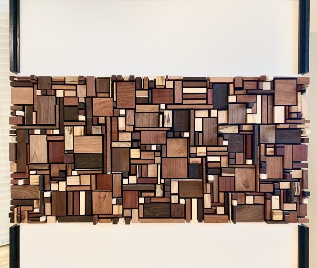 - Medium: Mosiac of Exotic Hardwoods, on Wood Panel with Custom Split Oak Frame