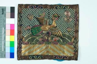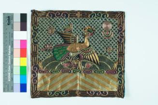 Descriptioninsignia for a 3rd rank civil official (woman or child), Malay peacock; bird is embroidered on a separate piece of material so that it could be changed if the official changed rank; brown silkStatus
