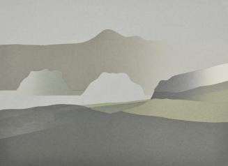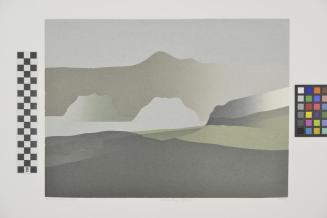 DescriptionBrown mountain background; Green and grey shore line in foreground; In middle ground is body of water with two green,grey islands in itStatus