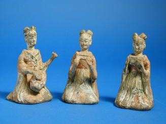 Descriptiona kneeling of sitting woman playing a wind instrument resemblind a pan pipe; grey earthenwareStatus