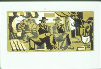 Descriptiona group of men, seatedColour: dark lime green;mustard;light orange;black