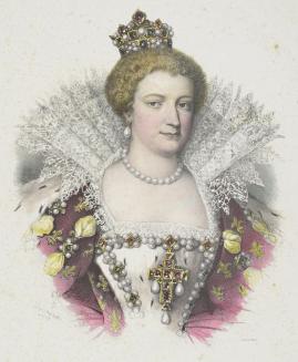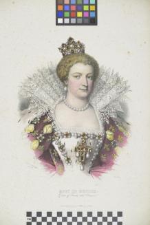 Descriptionportrait of Mary de Medicis, Queen of France and Navarre; in bejeweled dress and high lace collarColour: pink, yellow, brown