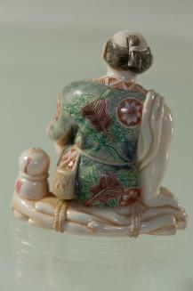 DescriptionFigurine depicts a man seated on a stack of bundled wood?; he has a pipe in his proper left hand;Status
