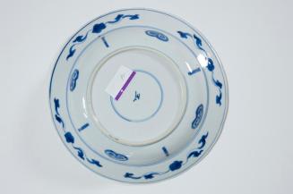 DescriptionSmall circular dish has a deep well and a very slight scallop on the wide flared rim. There blue and white designs and patterns in sections on the interior while the exterior is mostly white with occasional blue designs and circular bands.Status
