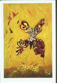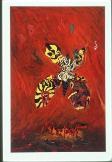 Descriptionbrightly coloured butterfly over large J. Shadbolt signature; poster from the exhibition Butterfly Transformations; backgrounds of each section differ from yellow, orange & redStatus