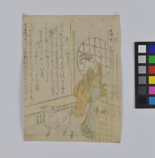 DescriptionInterior scene with kitchen items, of a woman and a sheep who is eating a paper or napkinStatus