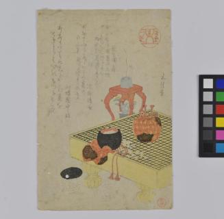 DescriptionImage is of a set up for a Go game with a board and containers of pieces. Japanese characters at top left.Status