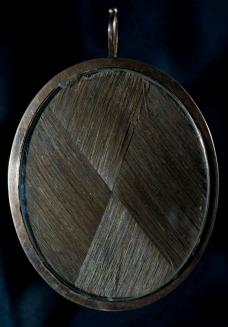 Descriptionoval shaped portrait of grey haired man in red uniform & black coat; blue & white sky like background; glass covers both sides; back is inset with brown hair; large loop attached to the top of the metal frame; the inscription on the order reads: Honi soit qui Mal y Pense (Evil be to he who Evil Thinks)Status