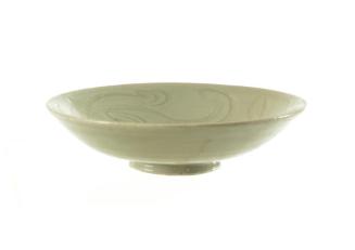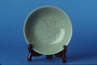 DescriptionShallow plate with incised floral scroll interiorColour: green