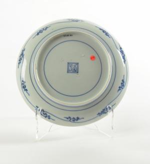 DescriptionKakiemon dish decorated in underglaze blue and overglaze enamels with a circle of underglaze blue petals with overglaze enamel stems and flowers, placed off centre, and semi circle of similar design also placed off centre. The underside of the rim with leaf scrolls in underglaze blue.Colour: blue;white
