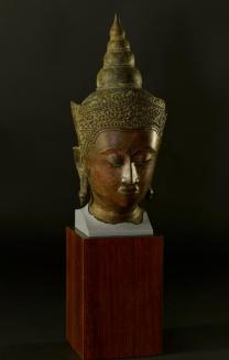 DescriptionThe Ayuthya period made Buddhist statues of the highest quality, of great variety and of astonishing vitality. Ayuthya sculptures like this example were extremely rich and proficient in every technique of sculpture. Ayuthya sculptures were the last of the great Thai schools of Buddhist sculpture. This example has exquisite and detailed adornments and earrings dangling from elongated ear lobes, which are typical of the period.