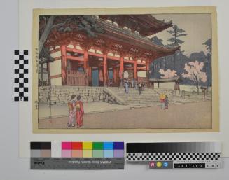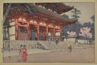 DescriptionLarge temple with stone steps. Two pink blossom trees to the right.Status