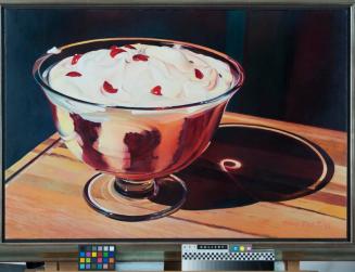Descriptionthe painting depicts a dish of trifle on a table; photorealist style