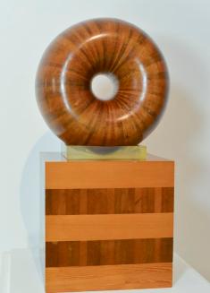 DescriptionThree part wooded sculpture. Square wooden base with clear plexi and donut shaped wooded element.Status