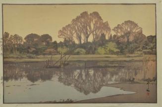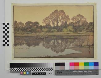 Descriptionlandscape with trees & a pond with reedsColour: brown;green;yellow
