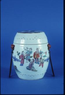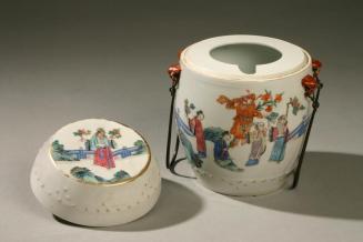DescriptionAn unusual lidded Famille rose teapot holder in the form of a miniature garden seat finely painted with figures in a fenced gardenStatus