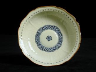 DescriptionBlue and white Arita dish in Kakiemon style. Floral design in underglaze blue in the centre of slightly raised well surrounded by border of triangular panels each with a flowerhead. The cavetto with underglaze "an hua" floral pattern in white slip; the rim with small blue circles in a border of underglaze moulded design in white slip. The foliate rim in brown.Colour: blue;white