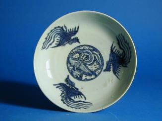Descriptionblue & white saucer dish with central phoenix medallion encircled by 3 more phoenixStatus