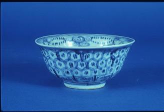 Descriptionblue & white bowl decorated in the well with blue Sanskrit Vraja symbol within a double blue ring (this symbol is often found in the centre of small bowls in the early/middle Ming period); the cavetto has lotus scrolls & the outside is decorated overall with 3 rows of interlocking medallions above a band of scrollsStatus