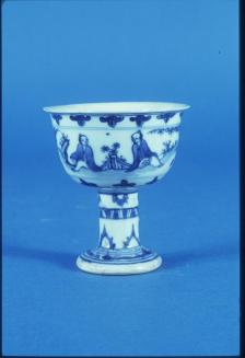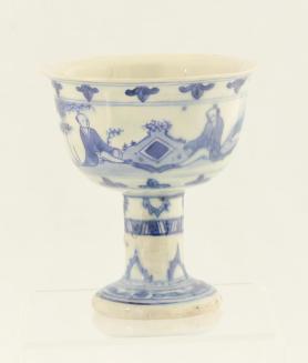 Descriptionblue & white stem cup decorated with 2 pairs of seated figures in a landscape between two bands of myi shaped leaves; the stem has a border of rocks below a band of stylized flowers; the foot is decorated with a band of flowersStatus