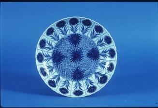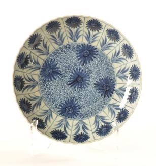 Descriptionblue & white saucer dish with a central decoration of 5 chrysanthemum heads (Chinese asters) with a background of whorls; the cavetto is divided into 16 panels each with a chrysanthemum flower; floral scrolls under rimStatus