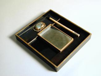 Descriptionlidded; writing box or suzuri-bako; exterior design has focal image of Bodhidharma; the fitted interior has a bronze inkwellColour: black