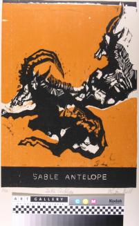 Descriptiontwo sable antelopes suspended in mid-air; below the two images is printed "SABLE ANTELOPE" against a black backgroundStatus