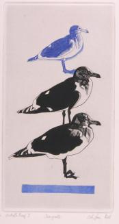 Descriptionprofile of three seagulls, one on top of the other in black and blueStatus