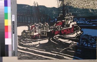 Descriptiontwo tugs meeting; circular cells at top right corner in olive greenStatus