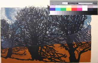 Descriptionblack trees in a dark blue landscape with a rusty brown foregroundStatus