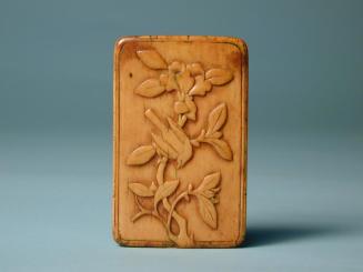 Descriptionpendant has low relief designs on both sides; one side has a bird on a branch, the other side has a scene with a spray of peonies.Status