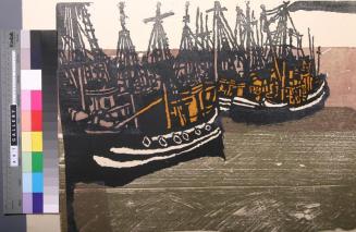 Descriptionthree boats, one large on far left, two smaller in centre, all highlighted with an orange colourStatus