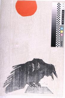 Descriptionprofile of a black crow on a black square surface, a red circle above the crowStatus