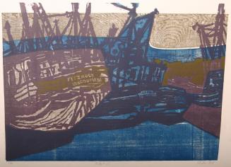 Descriptiontugboats, larger one named "fitzhugh,Vancouver BC in brown, smaller abstracted boats on the rightStatus