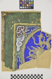 Descriptionan irregular shaped fragment of painted cloth/ ceiling tile from the Imperial Palace in BeijingStatus