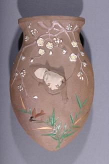 Descriptionraised and enameled design of a cat stalking a bird on brown ceramicStatus