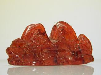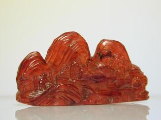 DescriptionBrushrest carved as a mountain with three peaks, sides with relief design of landscape with huts, trees and a recumbent ox;Status
