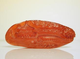 DescriptionTwo sided pebble carved with a landscape with pavilion & bridge on one side and on the reverse, boys playing.Status