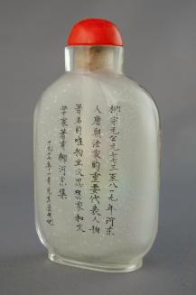Descriptionclear glass snuff bottle with interior painting of a bearded figure; ovoid section; 5 line inscription on obverseStatus
