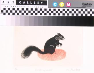 Descriptiona black squirrel on a salmon pink coloured ovalStatus